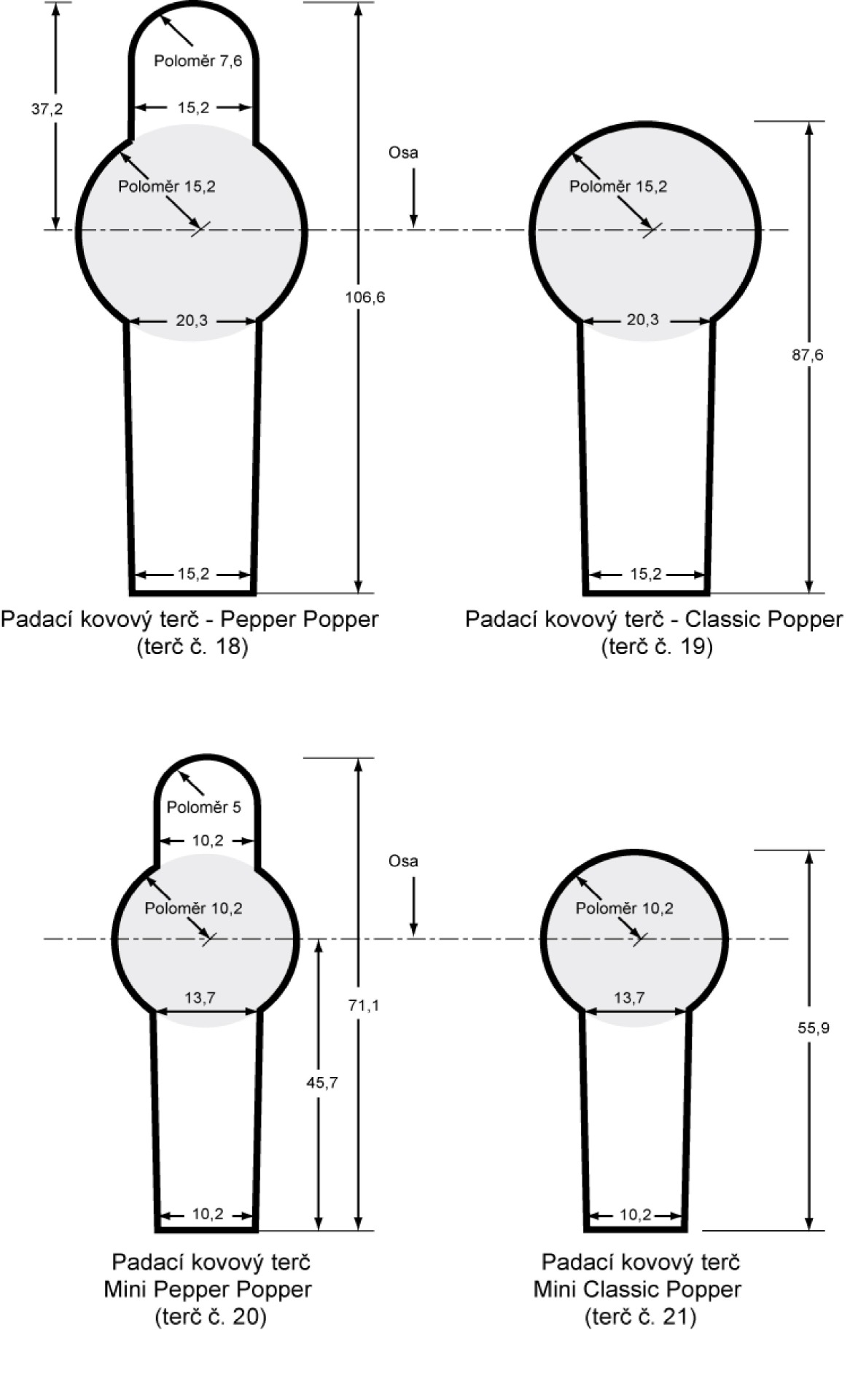 Padací reakční siluetové terče IPSC Pepper Popper včetně podstavce s úchytem terče. Padací terč je určen pro střelbu z ručních palných zbraní dle vojenského předpisu Vševojsk-4-2_2010.